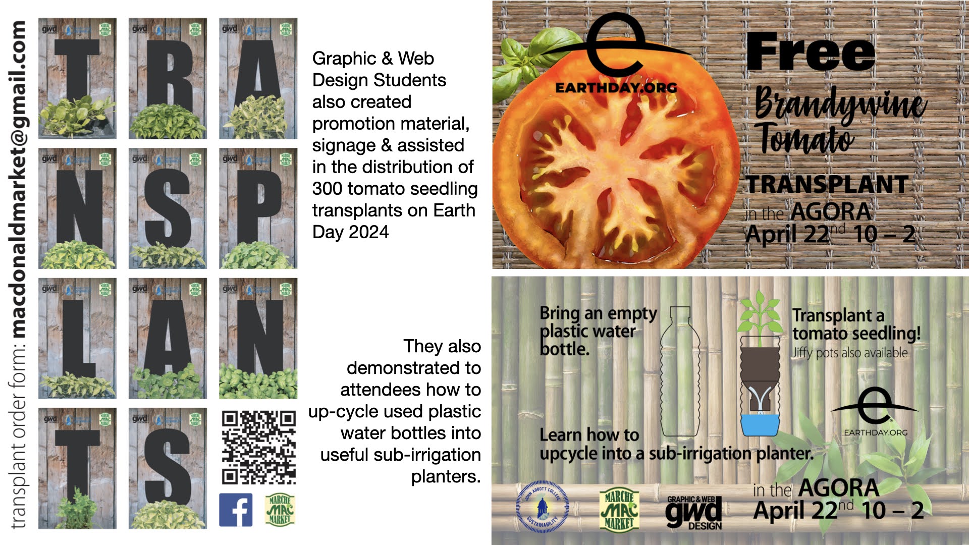 GWD students not only created event 'Transplants' posters but were on-hand to transplant the seedlings into compost pots and distributed them to the Earth Day attendees. Graphic & Web Design Students also created promotion material, signage & assisted in the distribution of 300 tomato seedling transplants on Earth Day 2024.